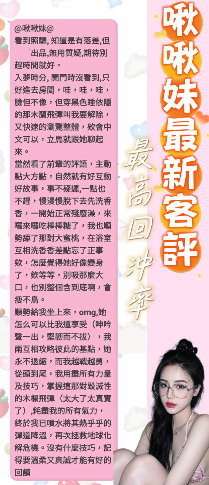 服務項目:共浴/無套吹/舌吻(視口腔清潔)/小親親/按摩/胸推/舔蛋/品鮑/69/角色扮演(客自備)…