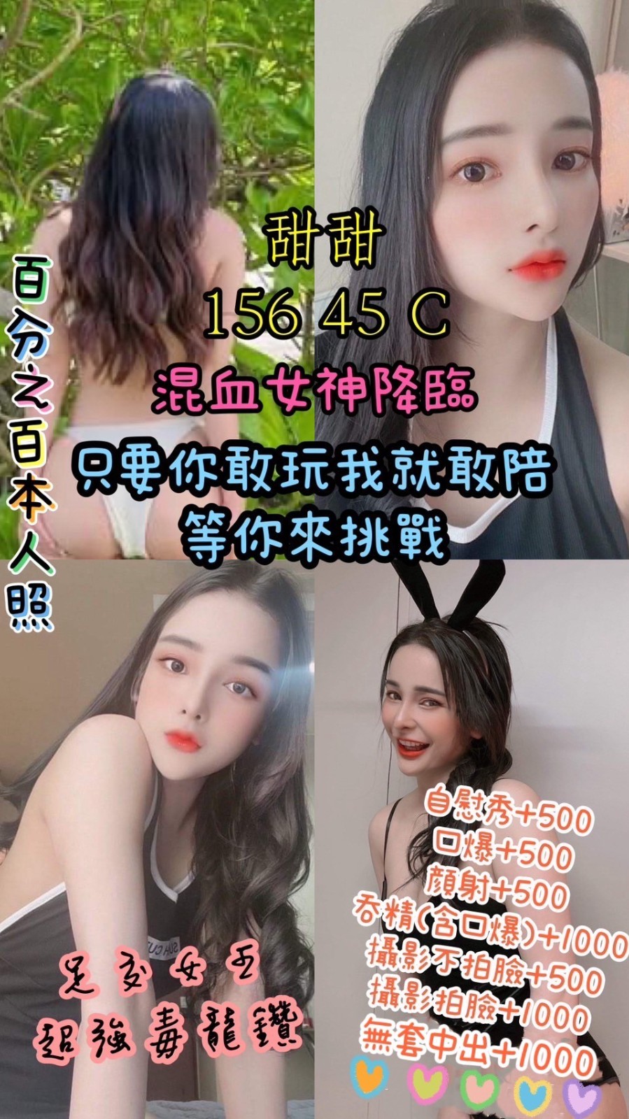 無套吹/共浴殘廢澡/親密KISS.激情舌吻(視個人衛生和妹妹現場感覺.自行開發)品鮑/六九/按摩/奶炮 胸推/屁推/冰火/艷舞