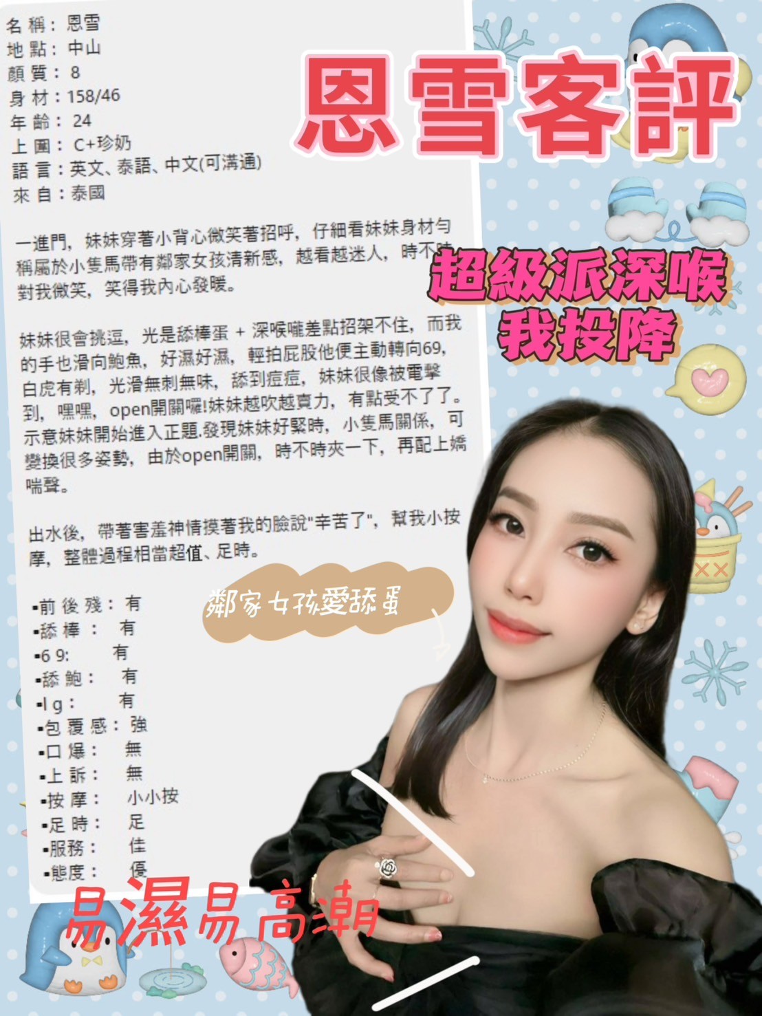 殘廢澡 奶洗浴 深喉嚨 無套吹 舌吻(視清潔度) 品鮑 69 冰火 水中蕭 按摩 奶炮 過水 漫遊 胸推 臀推 足交   絲襪愛愛(需自備) 穿高跟鞋愛愛(需事先告知) 顏射+500 口爆+500  無套+1000(可內射) 可30分 可2S 可兼90分(一天限量3班) 可2+1(買兩節50分鐘送20分鐘+1S) 可3+1 可包夜(4+2/5+3)